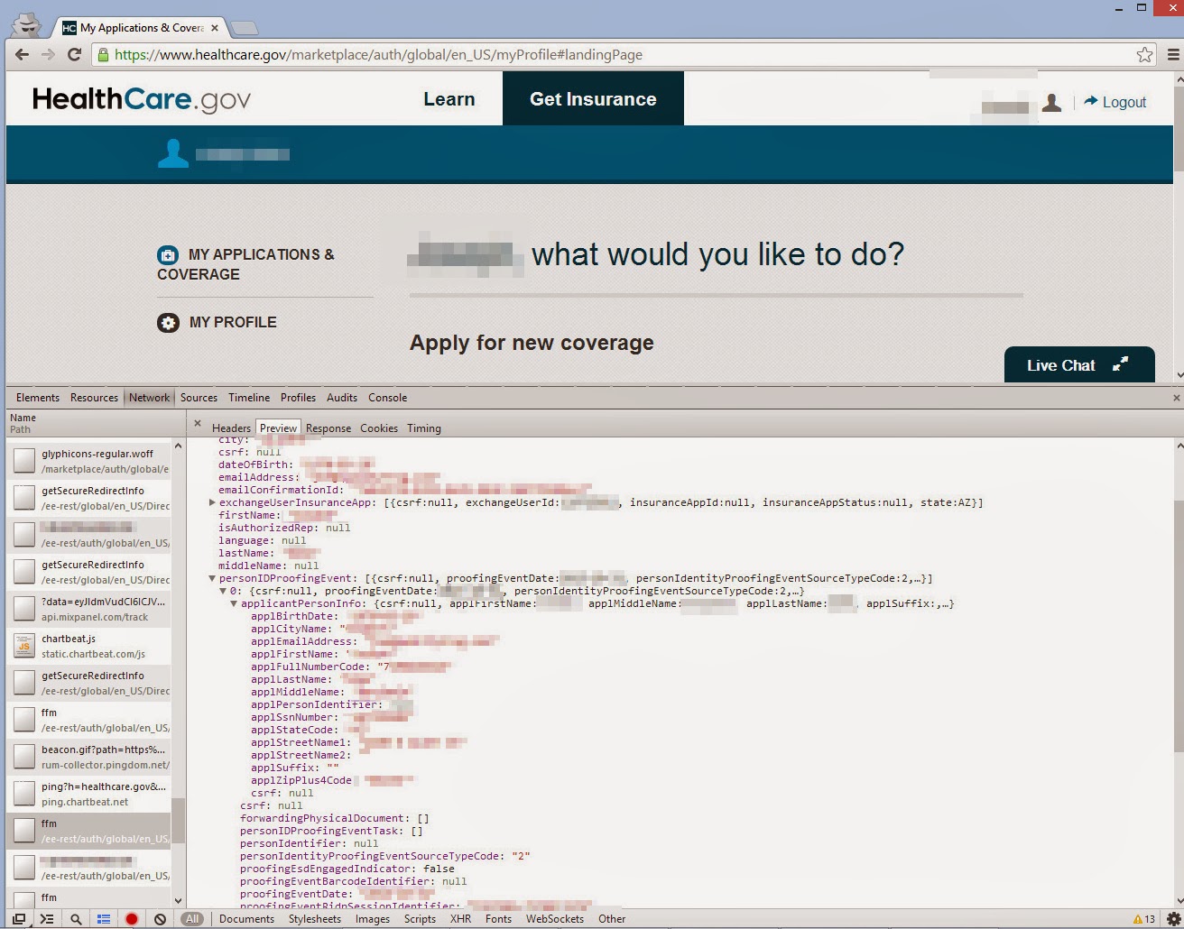 I understand that this data may be needed to process an insurance application, but I can think of no good reason to return all this data to the web browser. Returning such data retrieved from back end systems to the web browser increases the damage than can be done (and the value to identity thieves) in cases that accounts are compromised. And, if one has already obtained another's Name, date of birth, and Social Security Number, I suspect that Healthcare.gov could be easily used to gather more information.